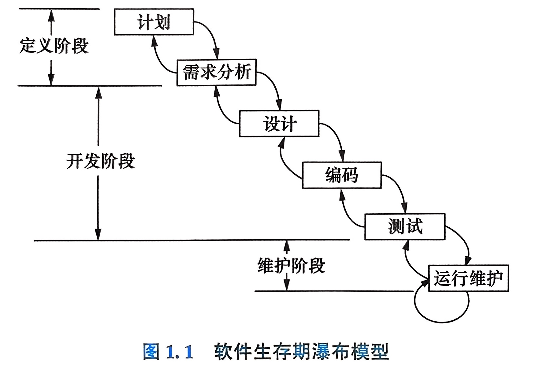 软件生存期分为六个步骤:计划(Planning)、需求分析(Requirement Analysis)、设计(Design)、程序编写(Coding)、测试(Testing)、运行和维护(Run and Maintenance)。